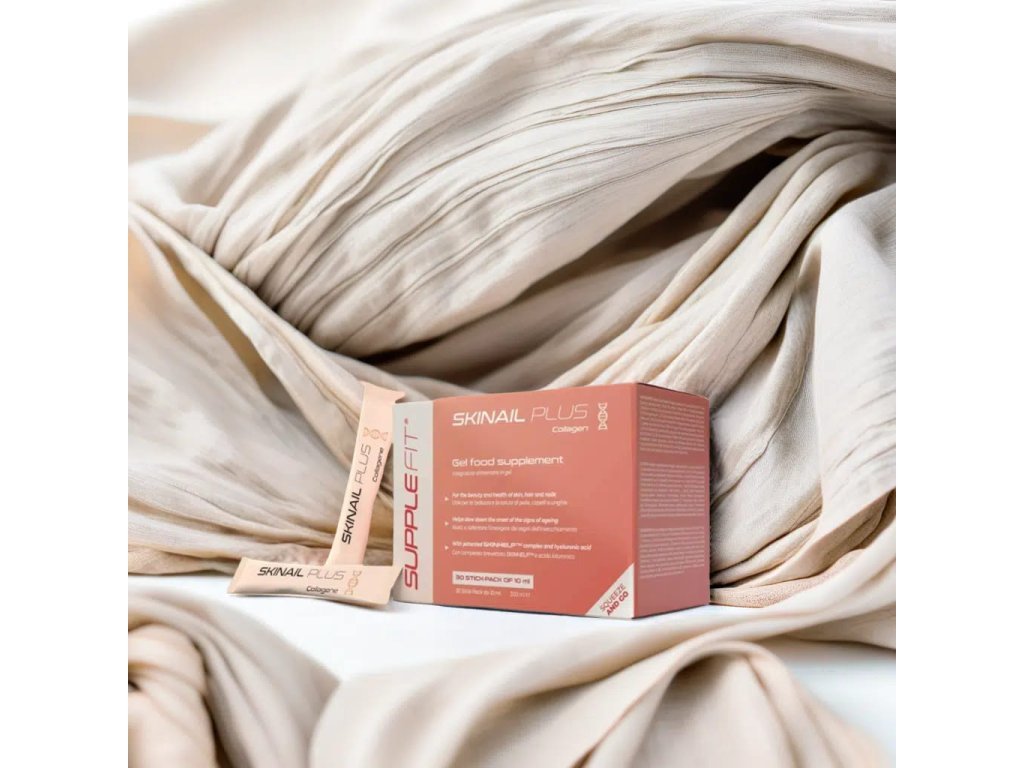 SKINAIL PLUS je doplněk stravy v gelu, připravený k okamžitému použití, s příchutí vanilky, navržený pro zdraví a krásu pleti, vlasů a nehtů. Jeho formule na bázi kolagenu, vitamínů skupiny B, vitamínu C a kyseliny hyaluronové přispívá k udržení pleti hydratované, elastické a tonizované, prevenci vzniku pih a vrásek. Zinek a biotin jsou ideální v obdobích stresu a při změnách ročních období, protože posilují nehty a bojují proti vypadávání vlasů, vracejí objem a lesk poškozeným vlasům. S patentovaným komplexem SKINHELP™.